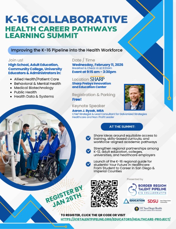 Summit Goal: Strengthen the K-16 healthcare talent pipeline in the San Diego and Imperial region by building and expanding partnerships across K-12, adult education, community colleges, universities to create seamless career pathways, increase awareness of healthcare programs and occupations, improve student outcomes, and address regional workforce shortages.